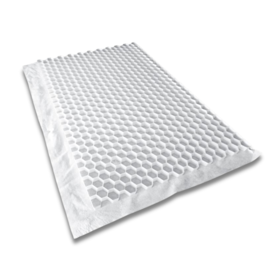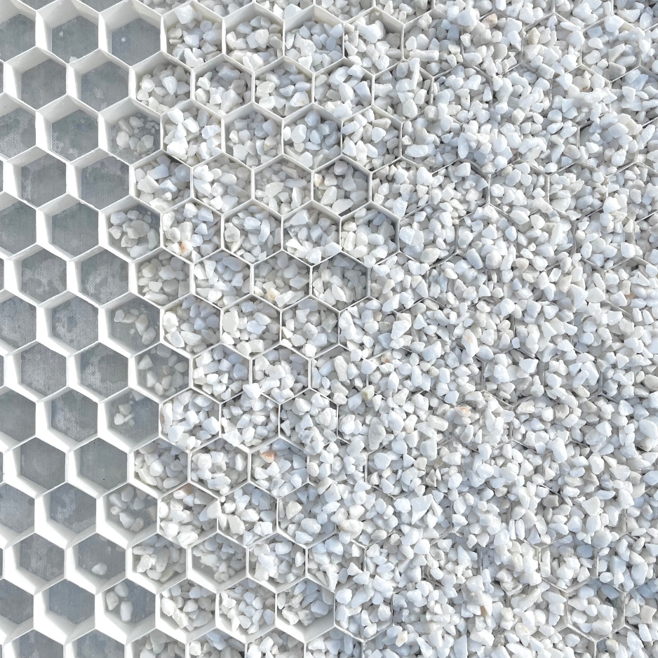 Dalle stabilisatrice pour gravier en polyéthylène haute densité , équipée d’un géotextile intégré sous les alvéoles.