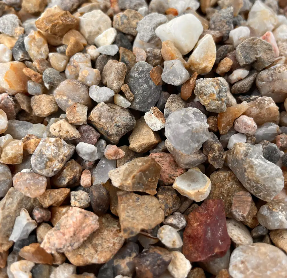 Le gravier alluvionnaire se caractérise par une variété de teintes naturelles et une texture lisse, idéale pour un rendu esthétique dans les projets d'aménagement extérieur.