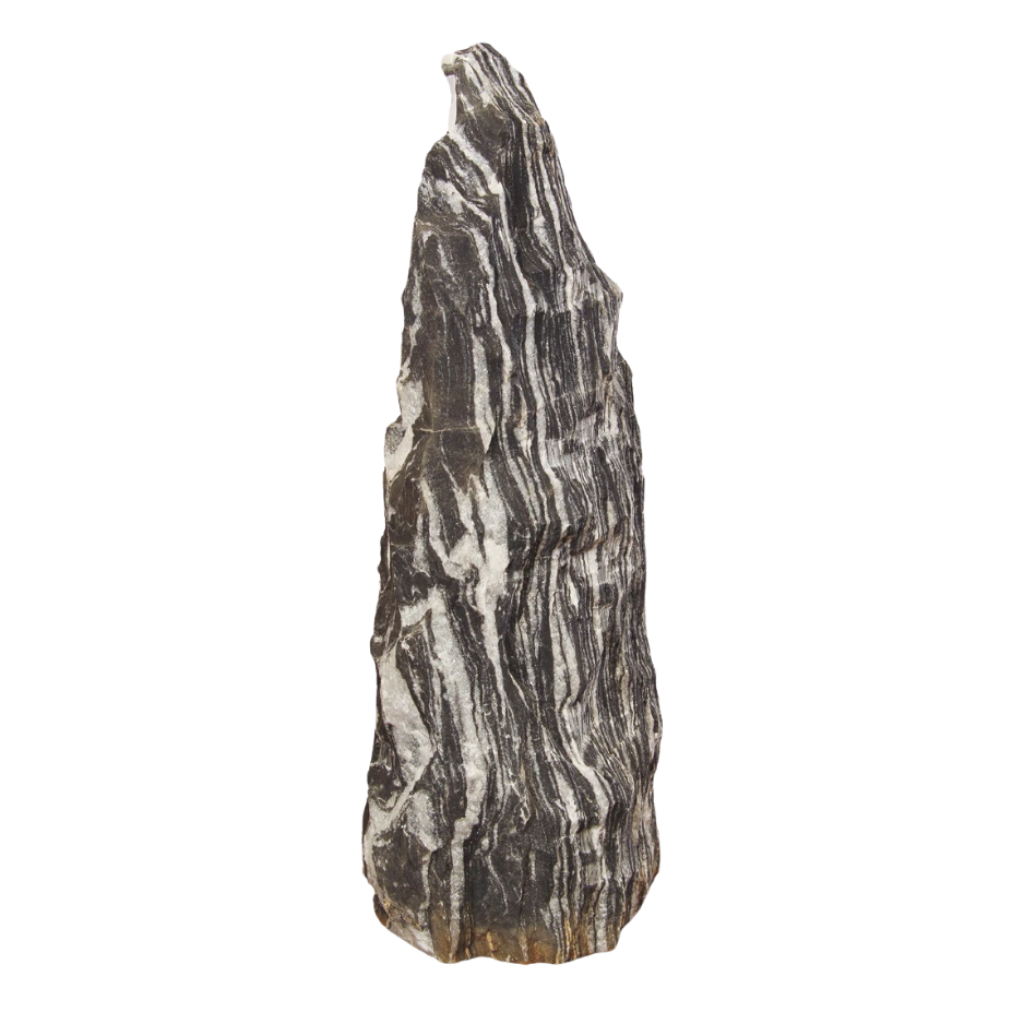 Le Monolithe Zebra 40-55 cm est une pierre décorative naturelle remarquable par son veinage noir intense traversé de lignes blanches contrastées , créant un effet visuel zébré unique.