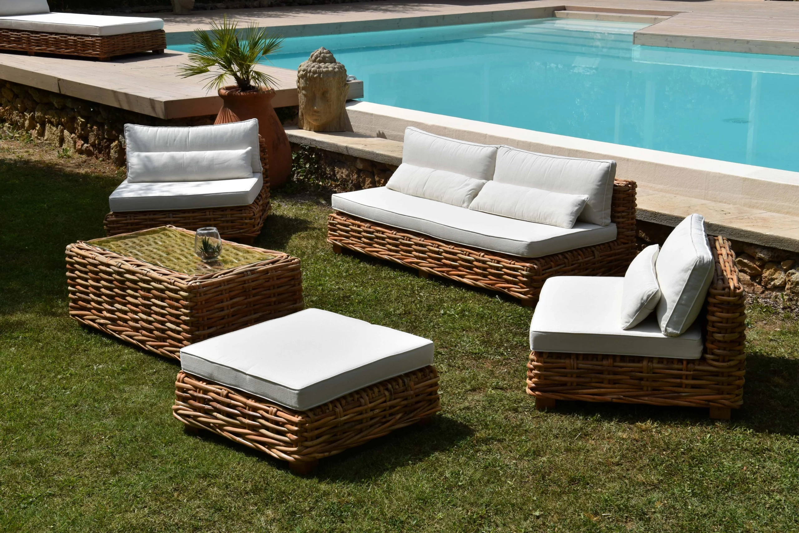 Fabriqué en rotin naturel tressé à la main, ce salon se distingue par sa robustesse et son authenticité. Son assise spacieuse, complétée par des coussins moelleux en tissu déperlant, garantit un confort absolu pour vos instants de détente.