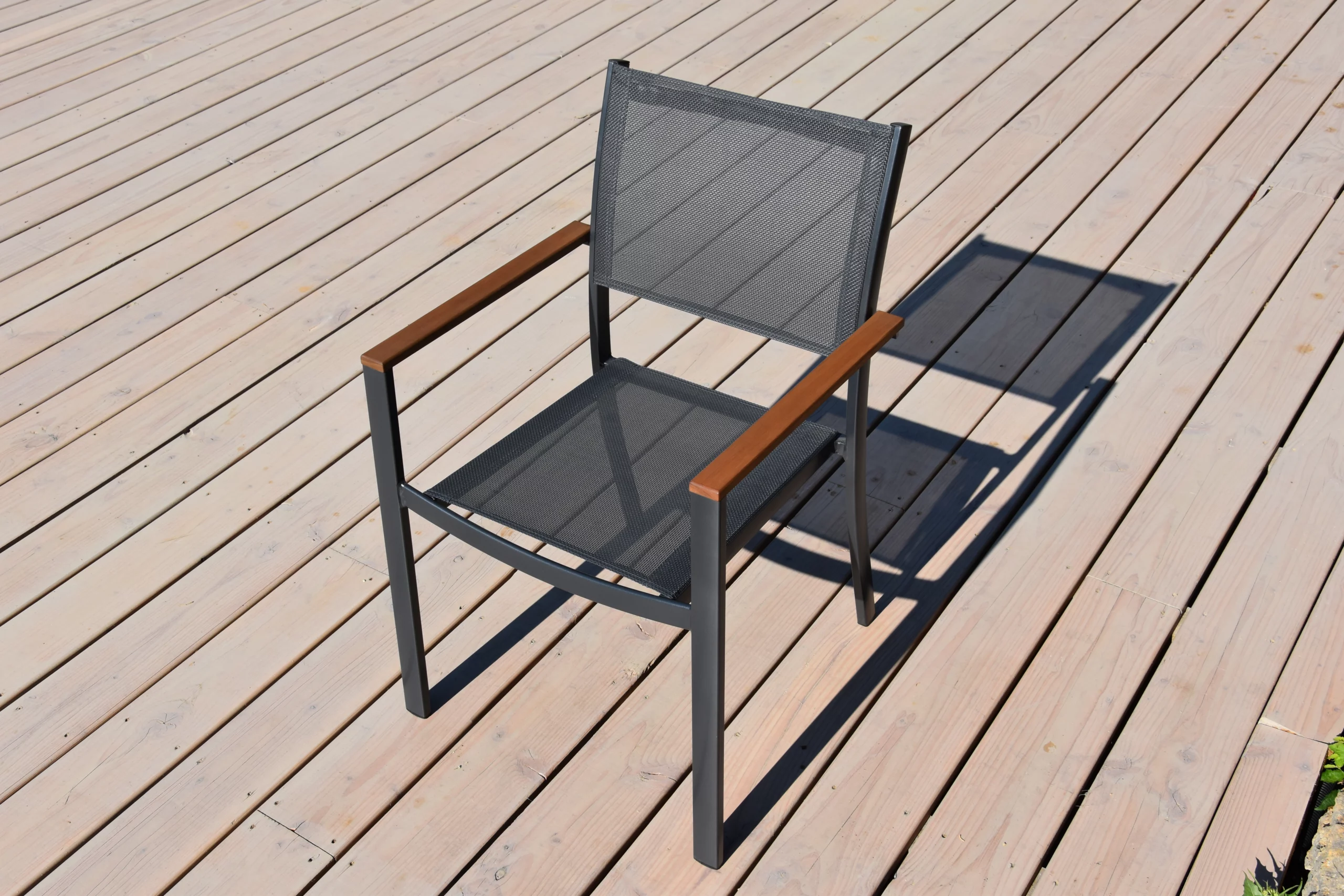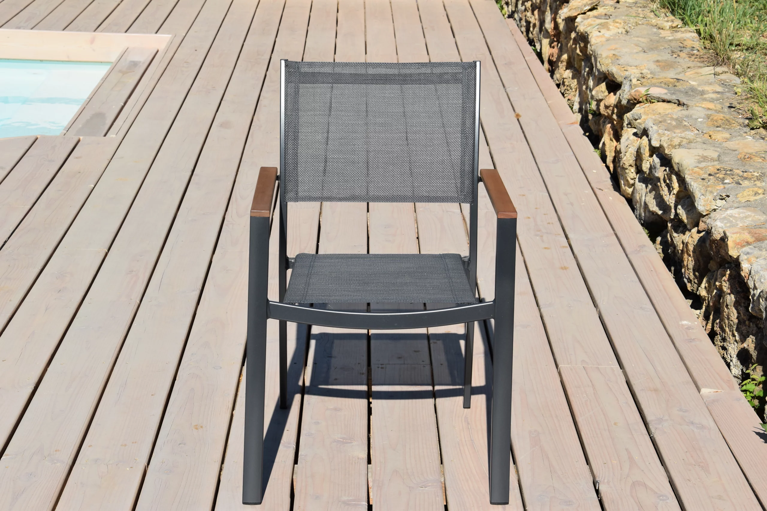 Conçu avec une structure en aluminium et une assise en textilène de haute qualité, ce fauteuil est léger, résistant aux intempéries et facile d’entretien. Les accoudoirs en bois ajoutent une touche naturelle et chaleureuse, tout en assurant un confort optimal.