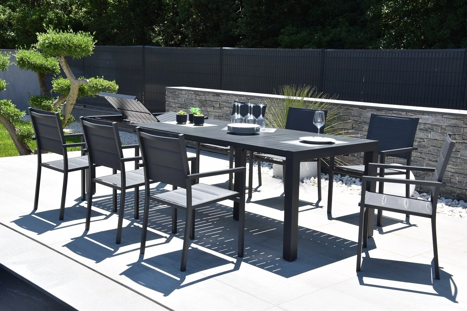 Sa structure en aluminium peint époxy assure légèreté et résistance à la corrosion, idéale pour un usage extérieur. Son plateau en céramique effet pierre allie esthétisme et durabilité, offrant une surface résistante aux rayures, aux UV et aux intempéries.