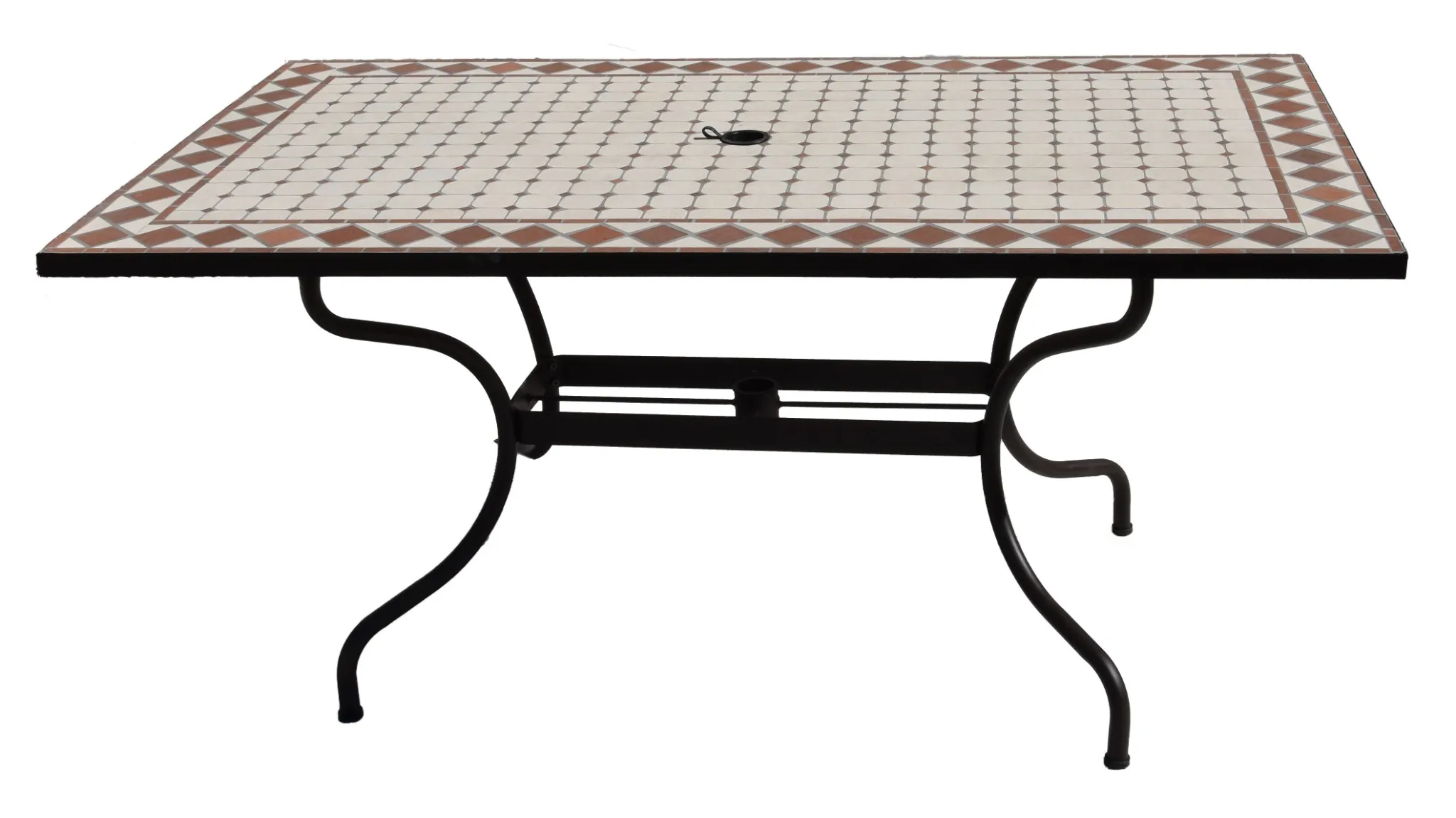 Son plateau en carreaux de céramique assure une excellente durabilité, résistant aux intempéries, aux UV et aux taches, tout en étant facile à entretenir. La structure en fer forgé garantit stabilité et robustesse, assurant une longue durée de vie.
