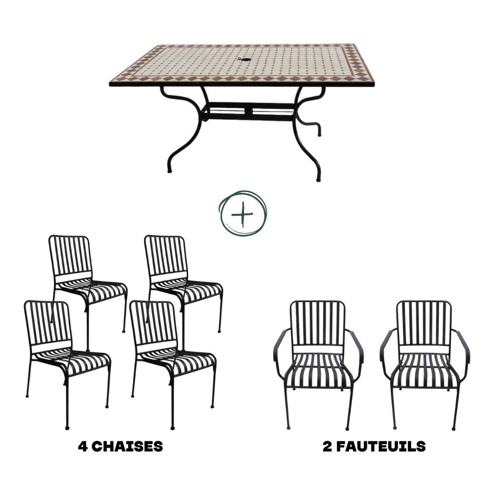 💡 À noter : Cet ensemble comprend 1 table rectangulaire + 4 chaises + 2 fauteuils en métal assortis.